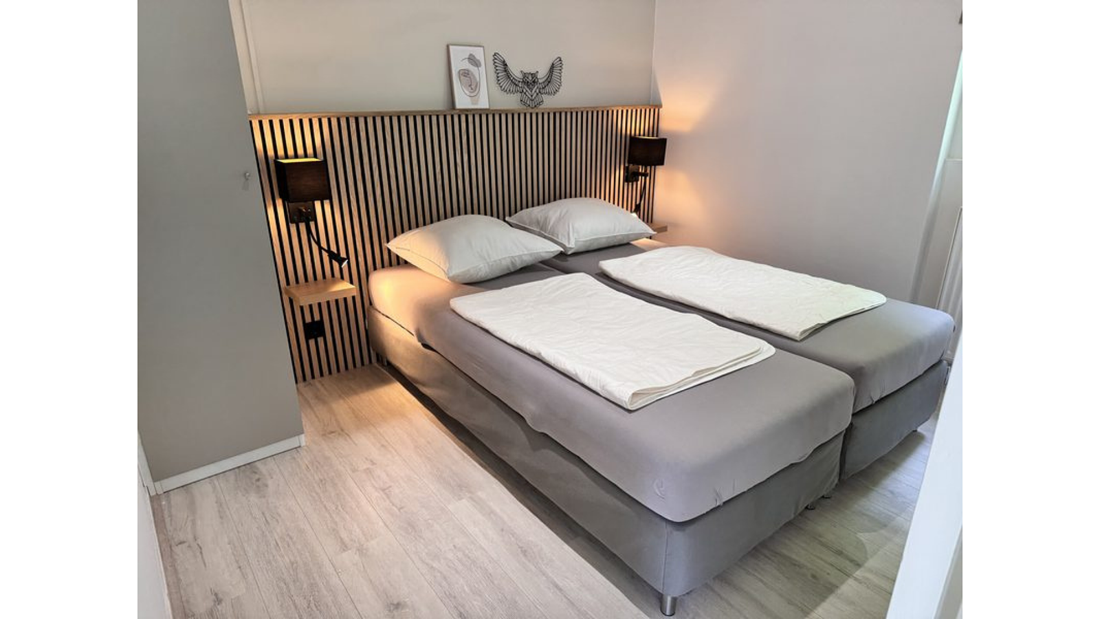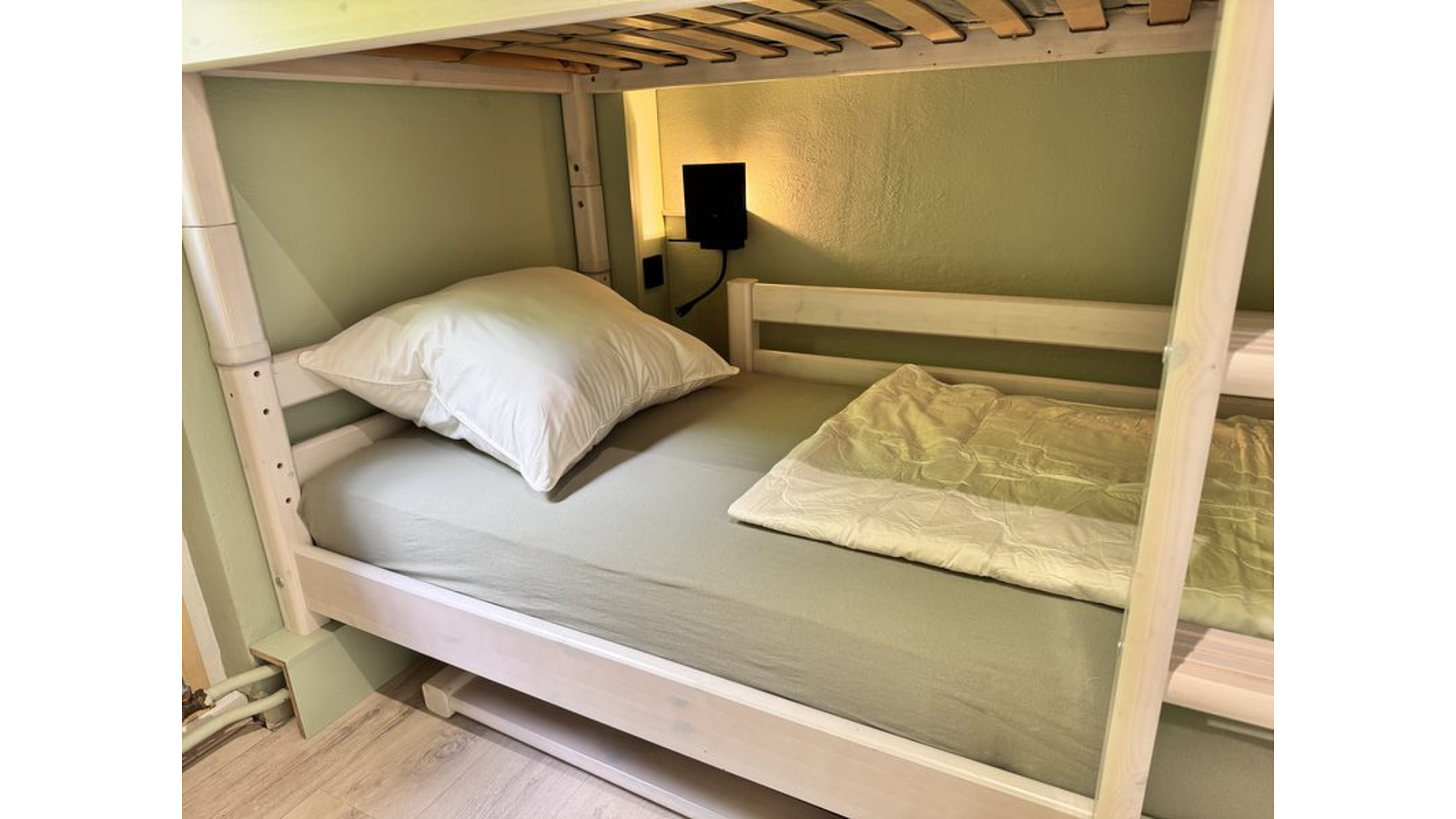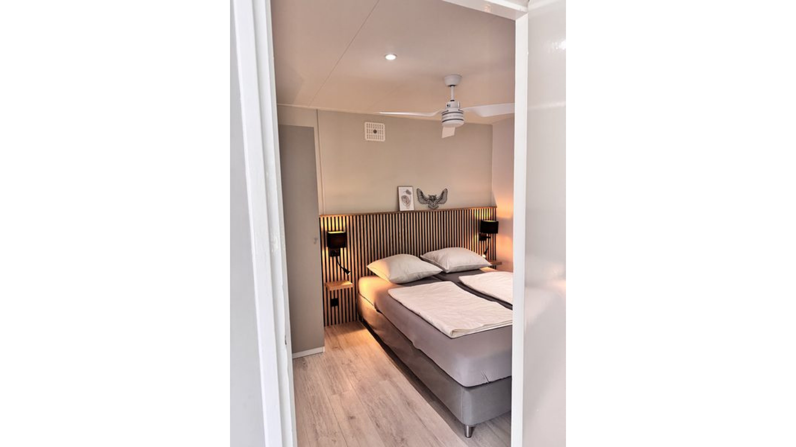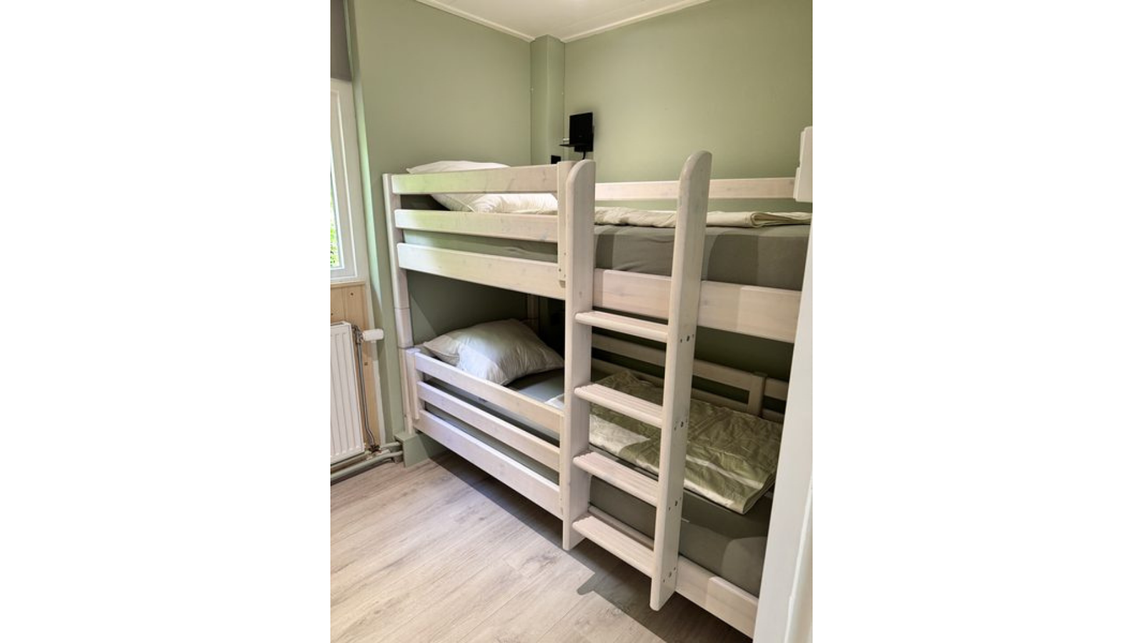 De master bedroom ademt rust en eenvoud, en biedt voldoende ruimte voor een kinderbedje – ideaal voor jonge gezinnen. In de tweede, kindvriendelijke slaapkamer staat een stevig stapelbed met uitvalbeveiliging, speciaal voor de kleintjes. Ook is er een praktische ladekast die dienst kan doen als commode voor de allerkleinsten.